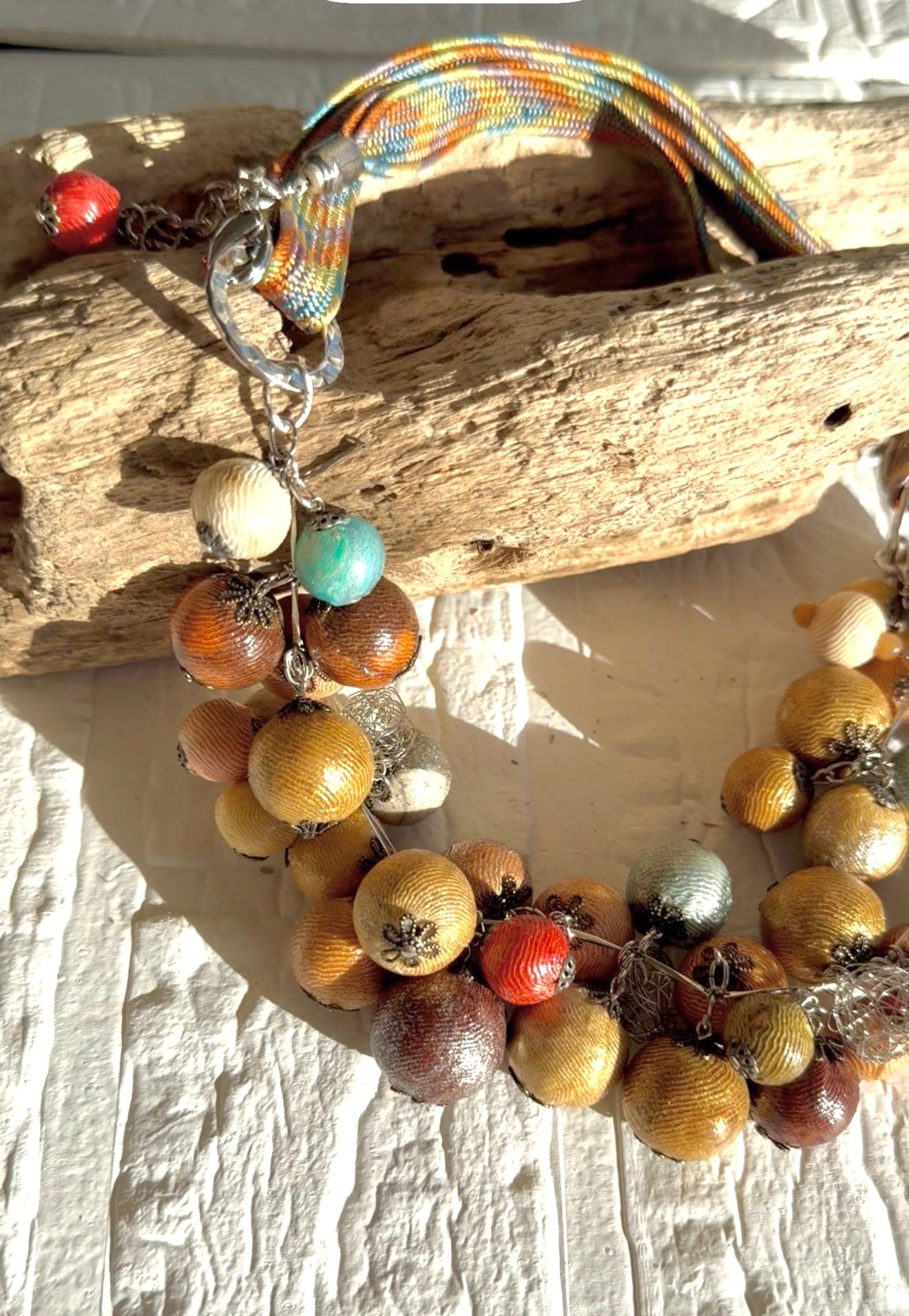 季節ごとの植物から色をいただき、一色ずつ丁寧に染め上げた布を、木製ビーズに一粒ずつ手作業で巻き上げました。