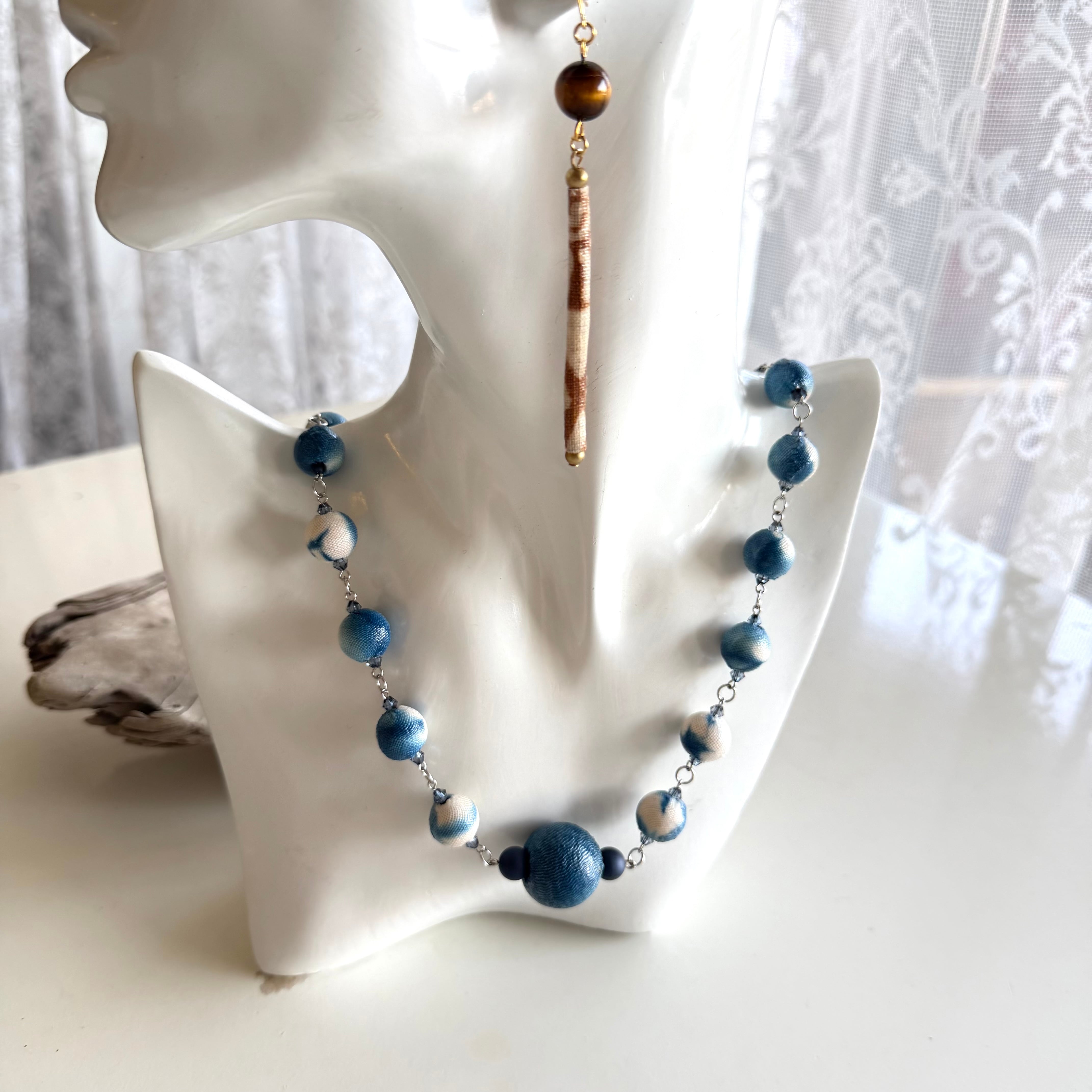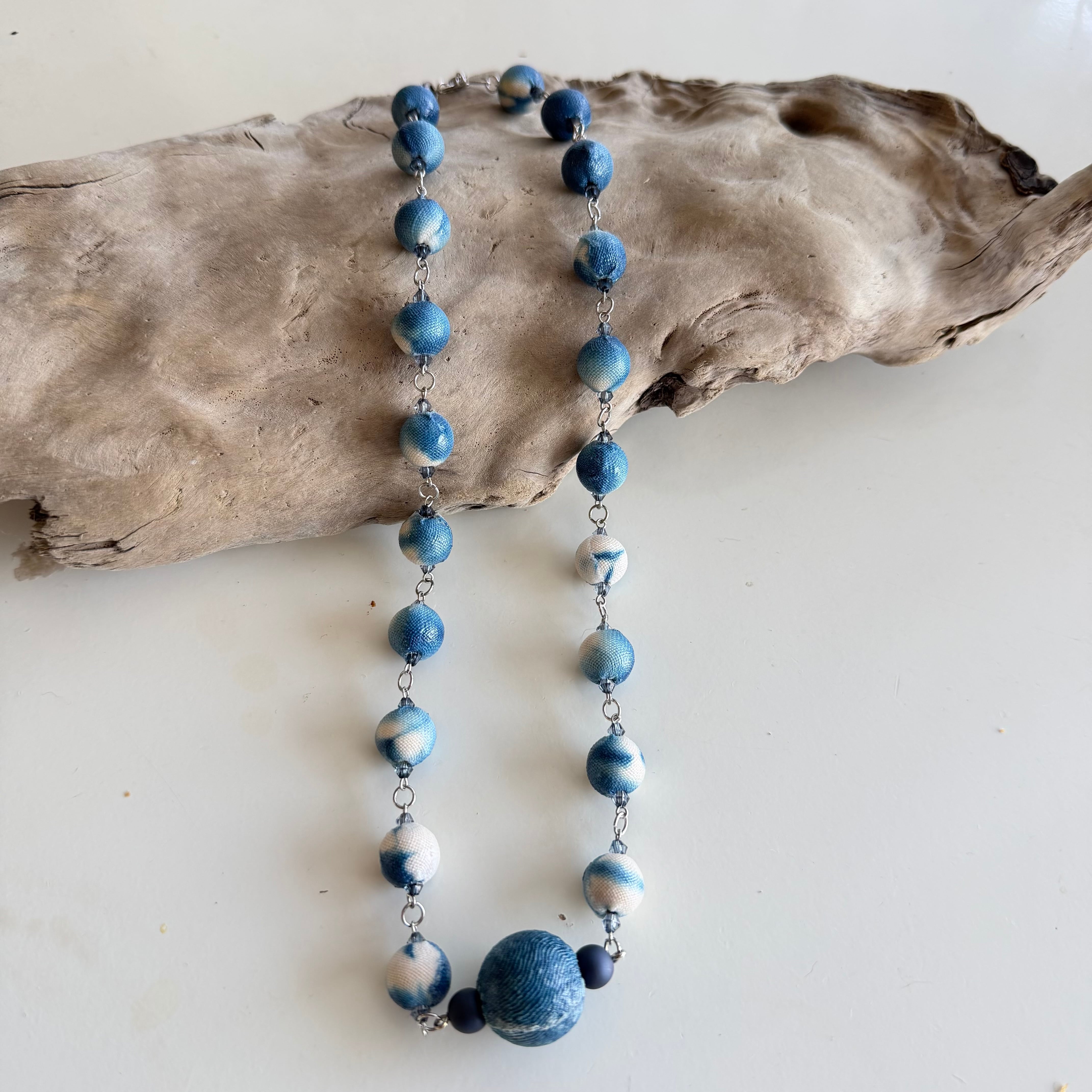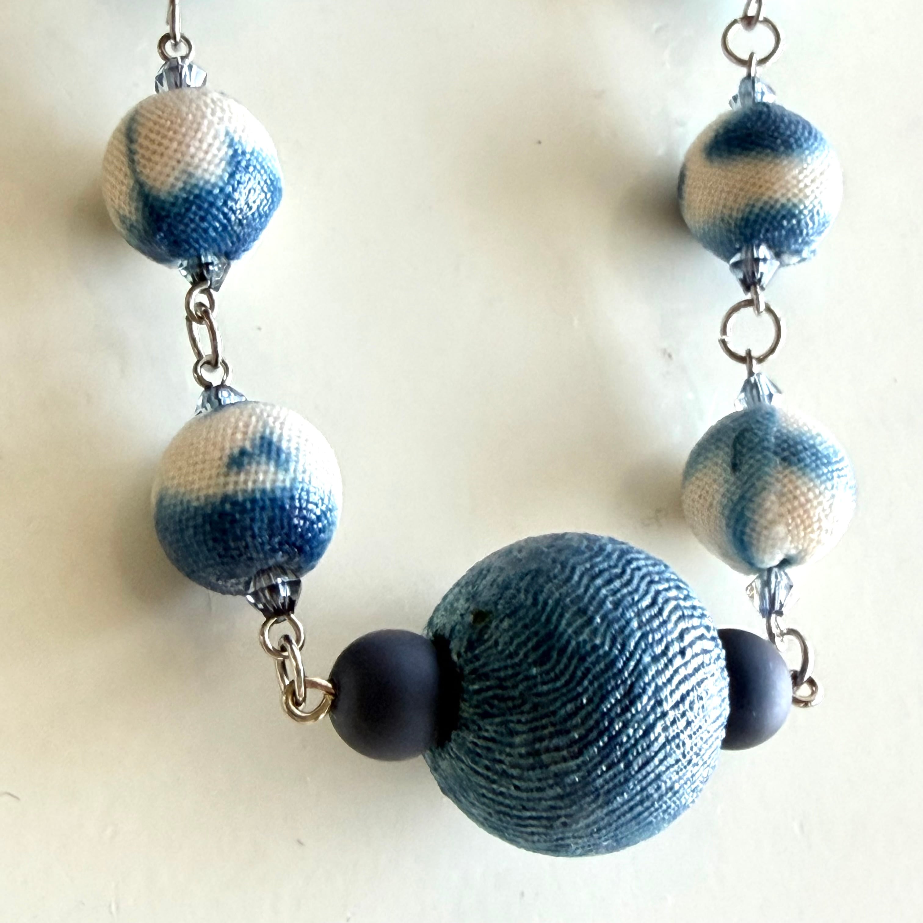 60年の経験を持つ作家が、伝統的な「藍染絞り」の布を、小さめの玉で仕立てた使い勝手の良いネックレスです。