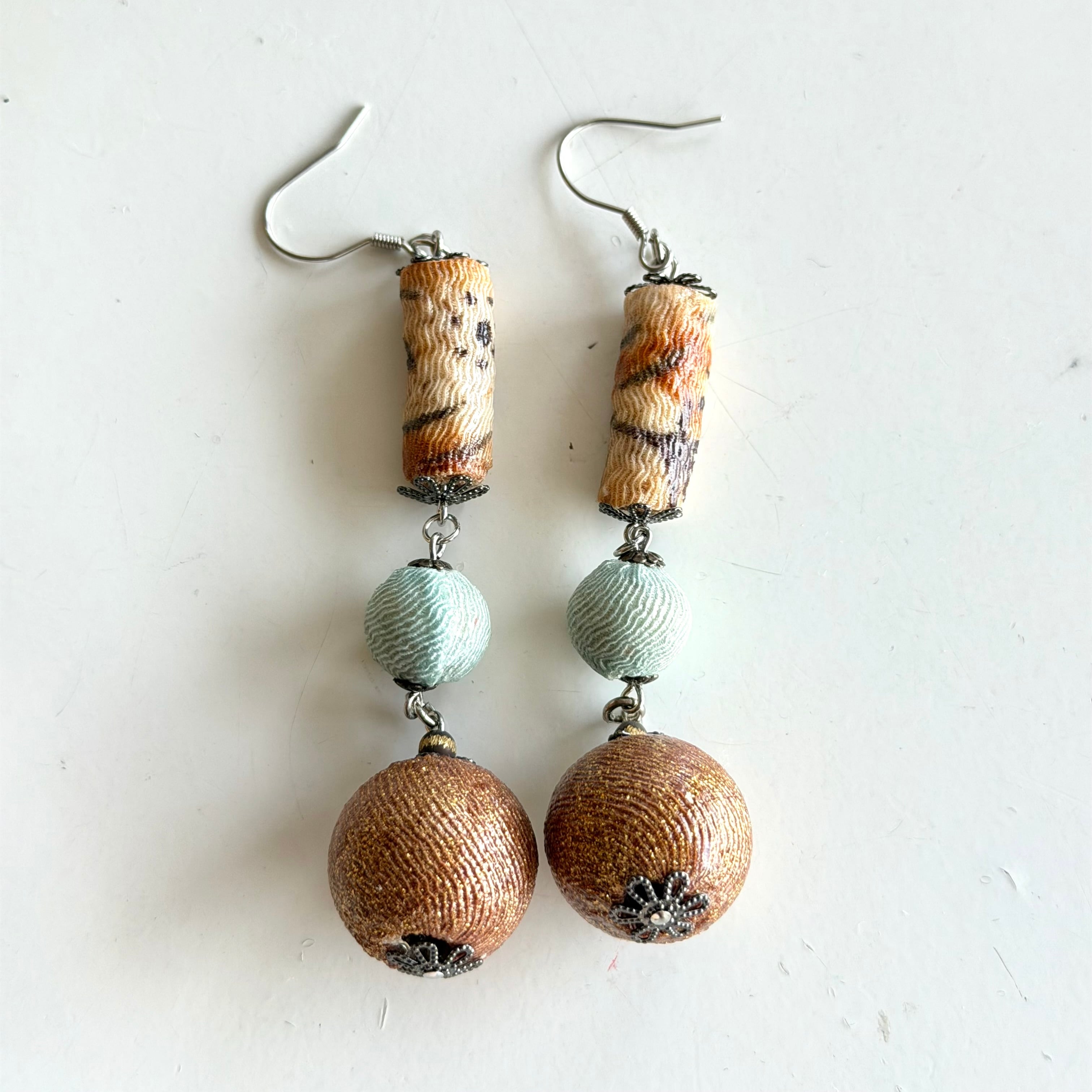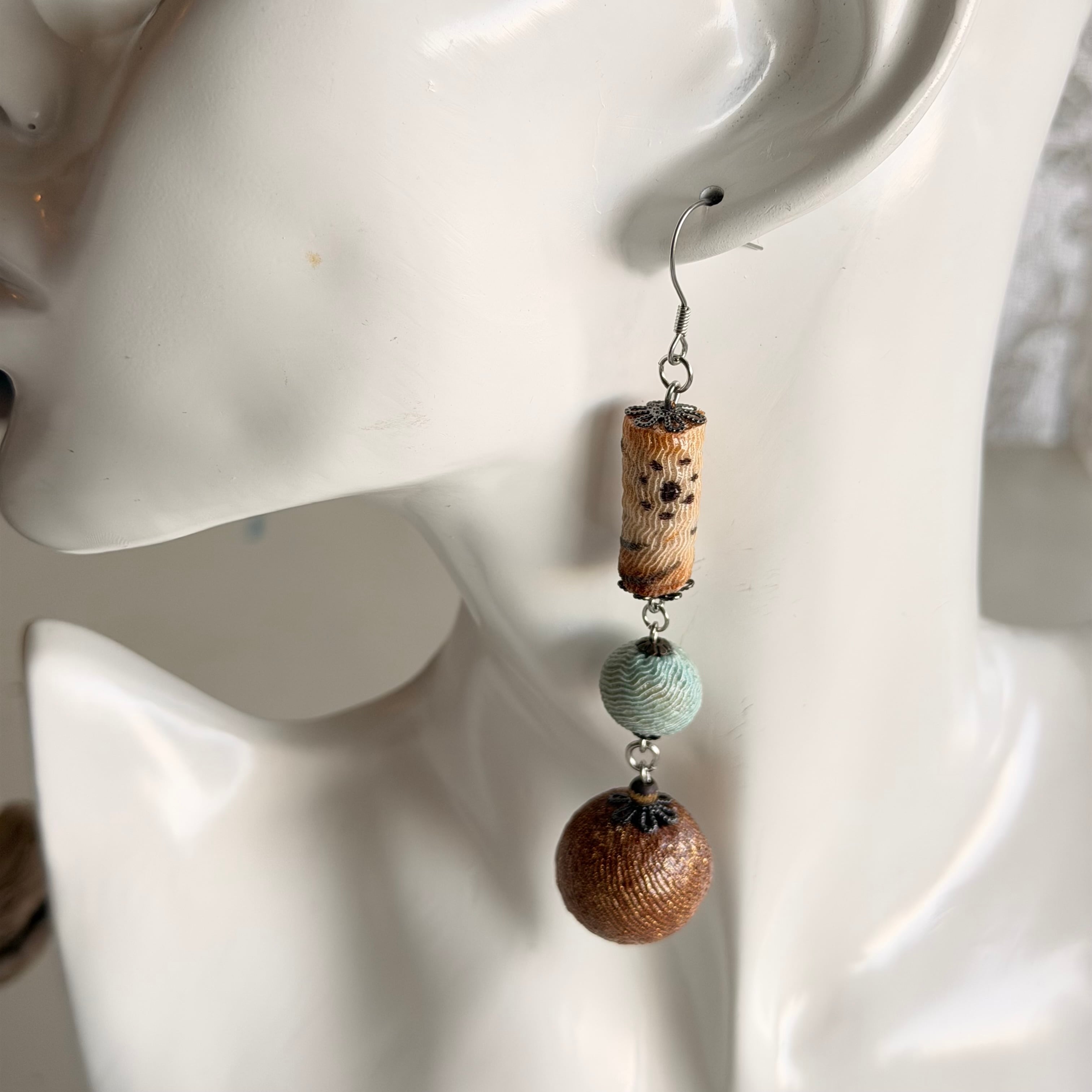 ヤブマオで柄を染め付けた、ニュアンスのある「円柱状のパーツ」を連ね、動くたびに軽やかに揺れるデザインに仕上げました。ブラウンと水色がおしゃれコントラスト!